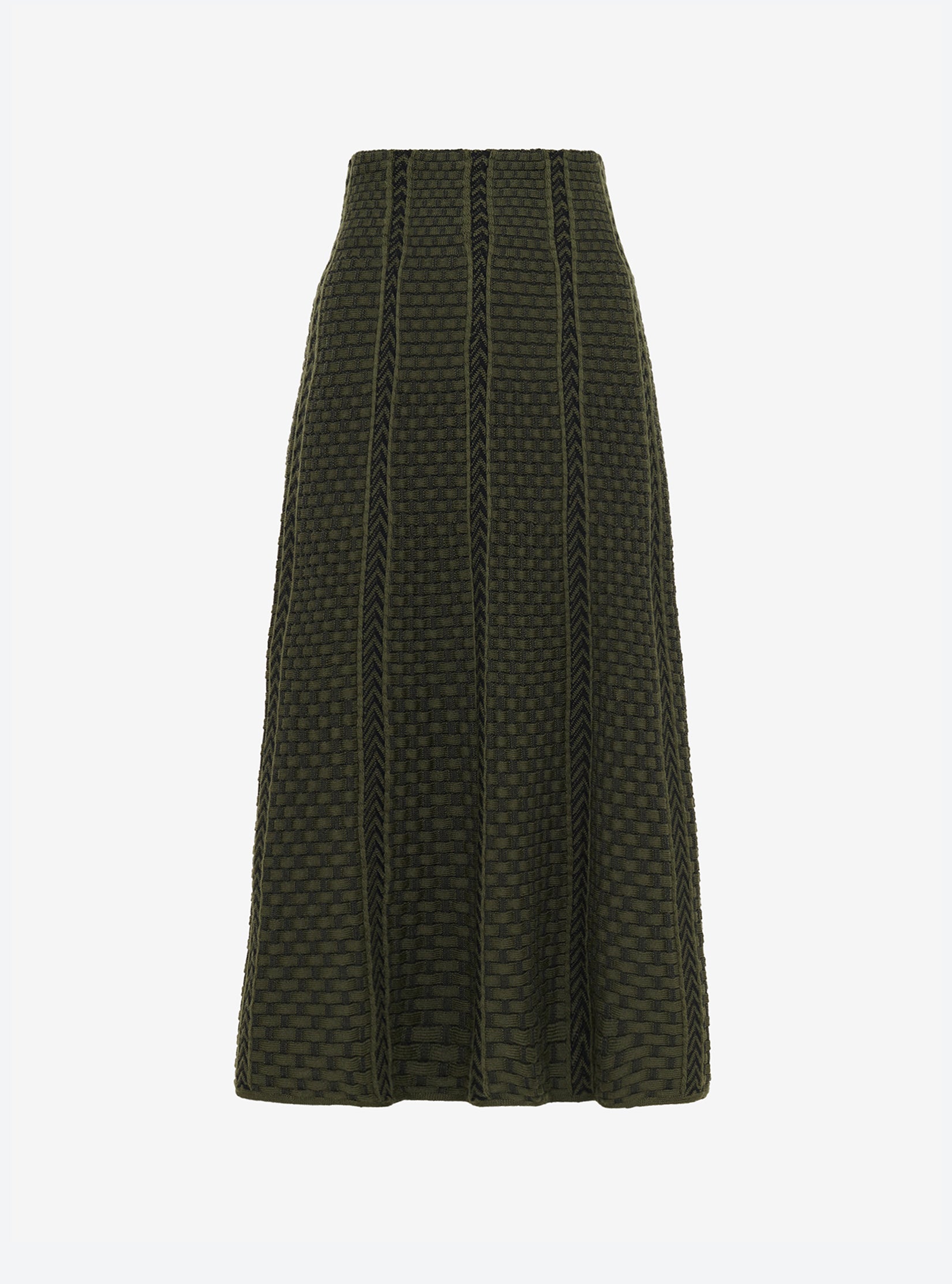 This mid-length, high-waisted fine knit skirt made in France from a blend of extra-fine virgin wool and rayon yarns, features a stitch pattern inspired by woven baskets. Its unique knit gives it a refined texture and fluid, elegant drape. The discreetly knit hidden waistband assures total comfort while visually lengthening the silhouette.