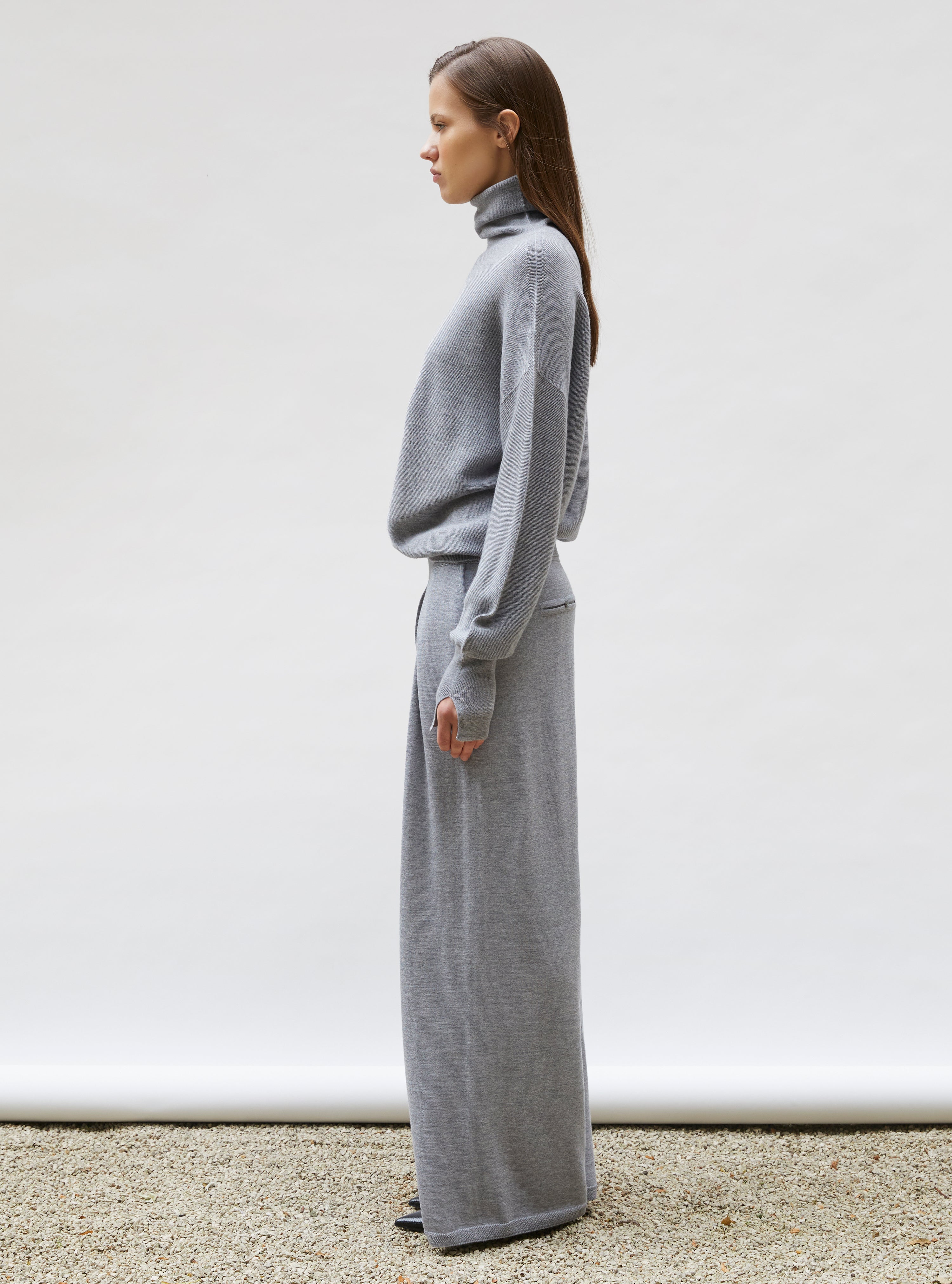 A timeless, iconic piece in the Molli collection, this slim knit top in a garter stitch is made seamlessly for great comfort. Made in Italy in a soft, extra-fine wool, it has a soft drape and beautiful structure. Its oversized cut, wide slit cuffs and high collar that pleats naturally at the neck make it an ideal feminine piece for any occasion.