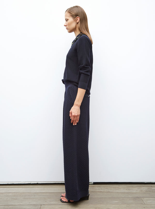Tricoté en Italie dans une maille jersey d’une grande fluidité, ce pantalon de luxe ample à taille haute présente une large ceinture en maille festonnée rappelant les ceintures de smoking. Sa maille jersey impeccable lui apporte fluidité au porter. Rehaussé de ses plis creux sur le devant, ce modèle intemporel est d'une allure élégante et sophistiquée.